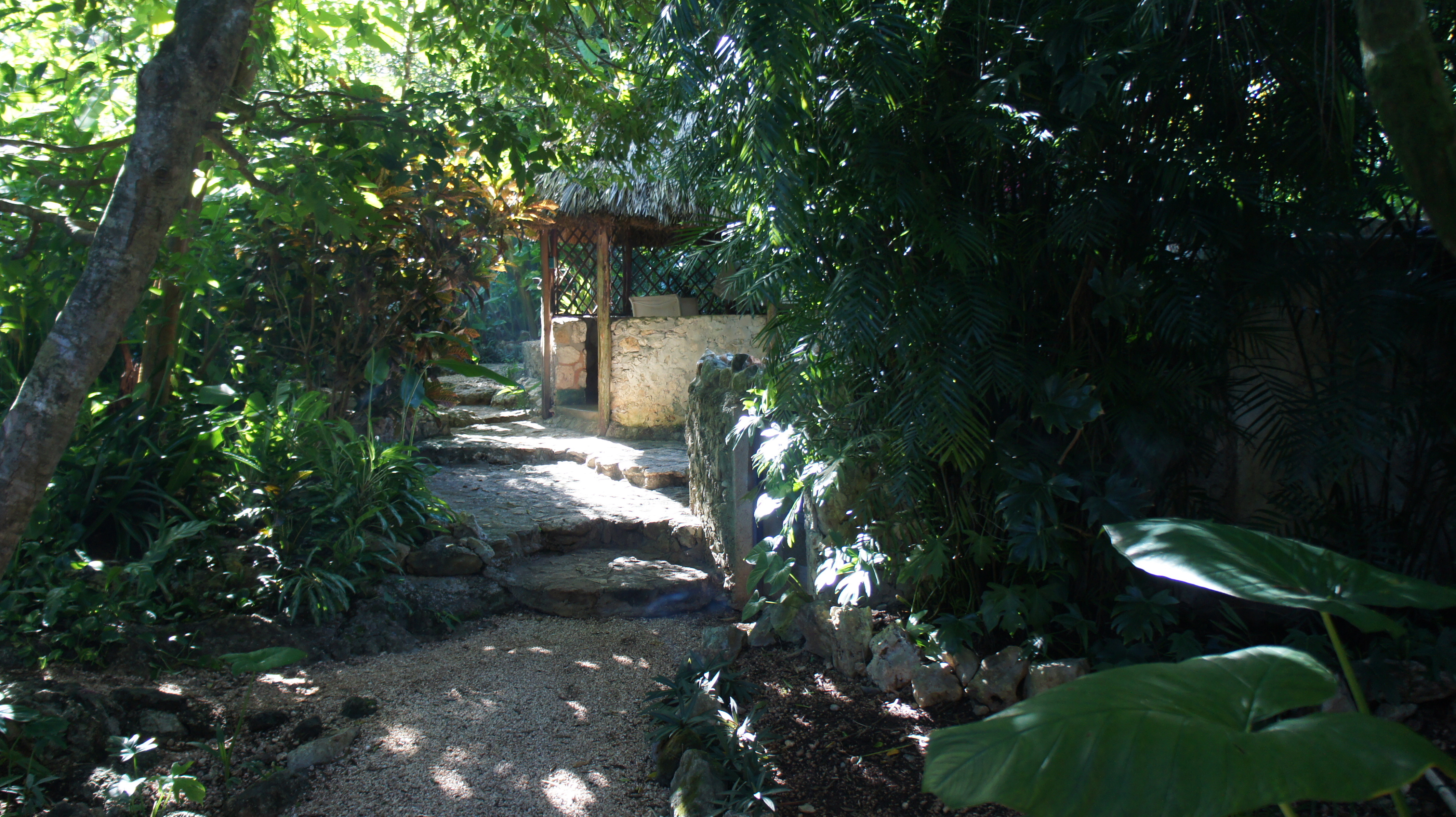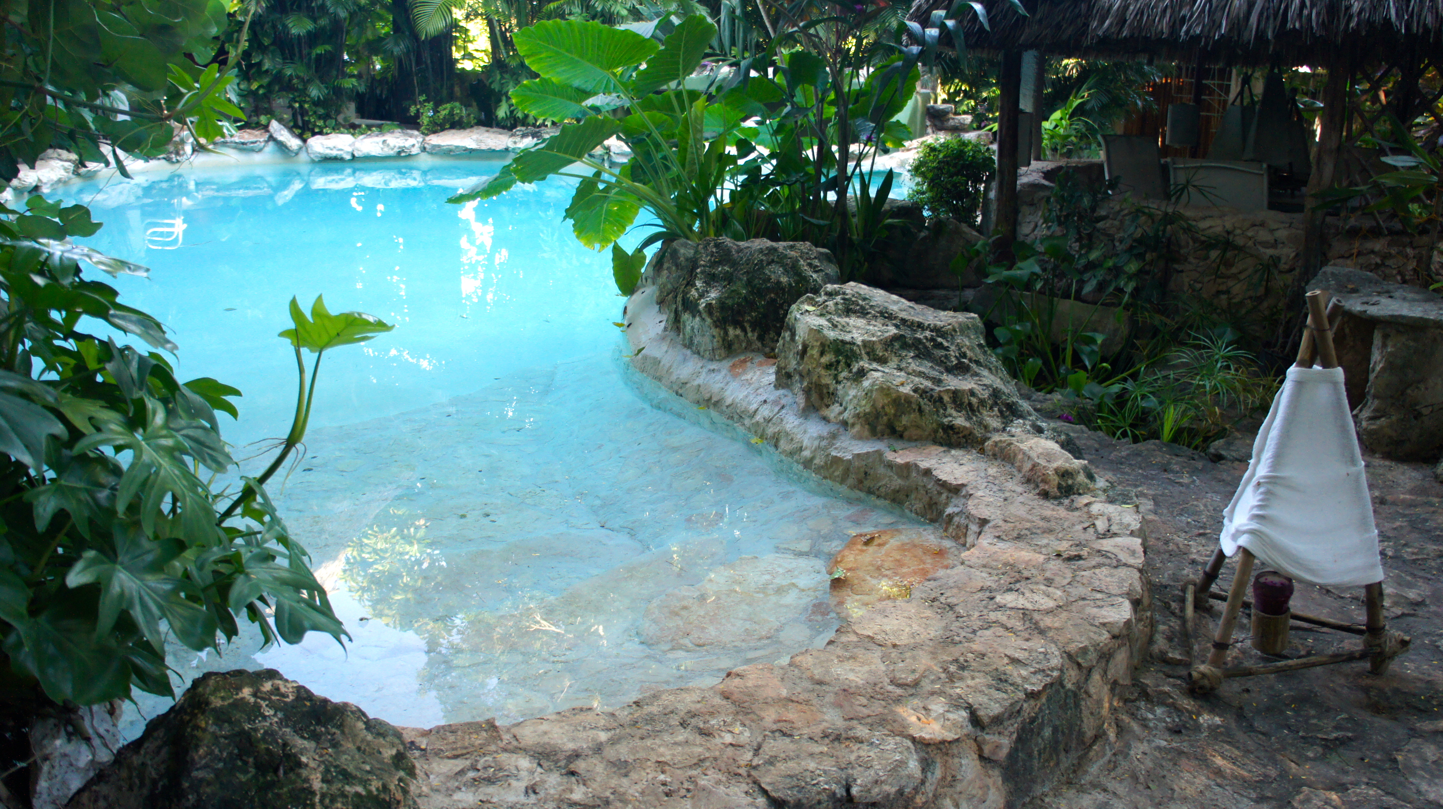 I stir again around 3 in the morning when the village roosters start shrieking their mating calls. Not much fun when it sounds like it’s coming from underneath the bed. I watch as the rising sun finally illuminates our little retreat deep within the jungle. I go for a short walk at first light, and I’m not disappointed, for I find myself surrounded by lush vegetation and incredible serenity. Elaine is already up preparing for the day, and she tells me a little bit about the history of the place dating back to the start of the excavations at Ek’ Balam. I also learn that the pool in the middle of the lodge draws water from an underground natural sink hole called cenote.