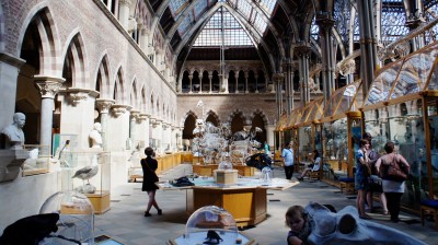 University Museum of Natural History and Pitt Rivers Museum. The 2 museums are adjacent (access to the latter is only gained through the former), yet very different in their focus. The University Museum of Natural History is, as expected, a family friendly array of various artefacts. The large square court with a glass roof, supported by cast iron pillars, divided into three aisles lined with restored victorian cabinets, looks like a magnificent cross between a cloister and a train station. The abundance of natural light illuminates the displayed artefacts, ranging from dinosaur skeleton replicas, fossils, to taxidermy with “Please touch” signs. The entomological displays with live specimens on the first floor are as terrifying as they are captivating. The head and foot of a dodo displayed at the museum are the most complete remains of a single dodo found anywhere in the world.