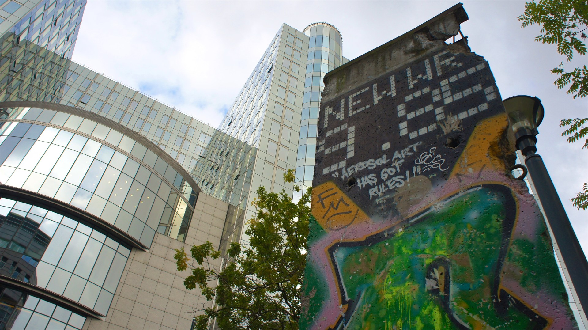 Part of the Berlin Wall with the building of the European Parliament in the background. The Wall was bare on the East Berlin side collared by a “death strip”, a deadly mine field, but on the West Berlin side graffiti art covered it